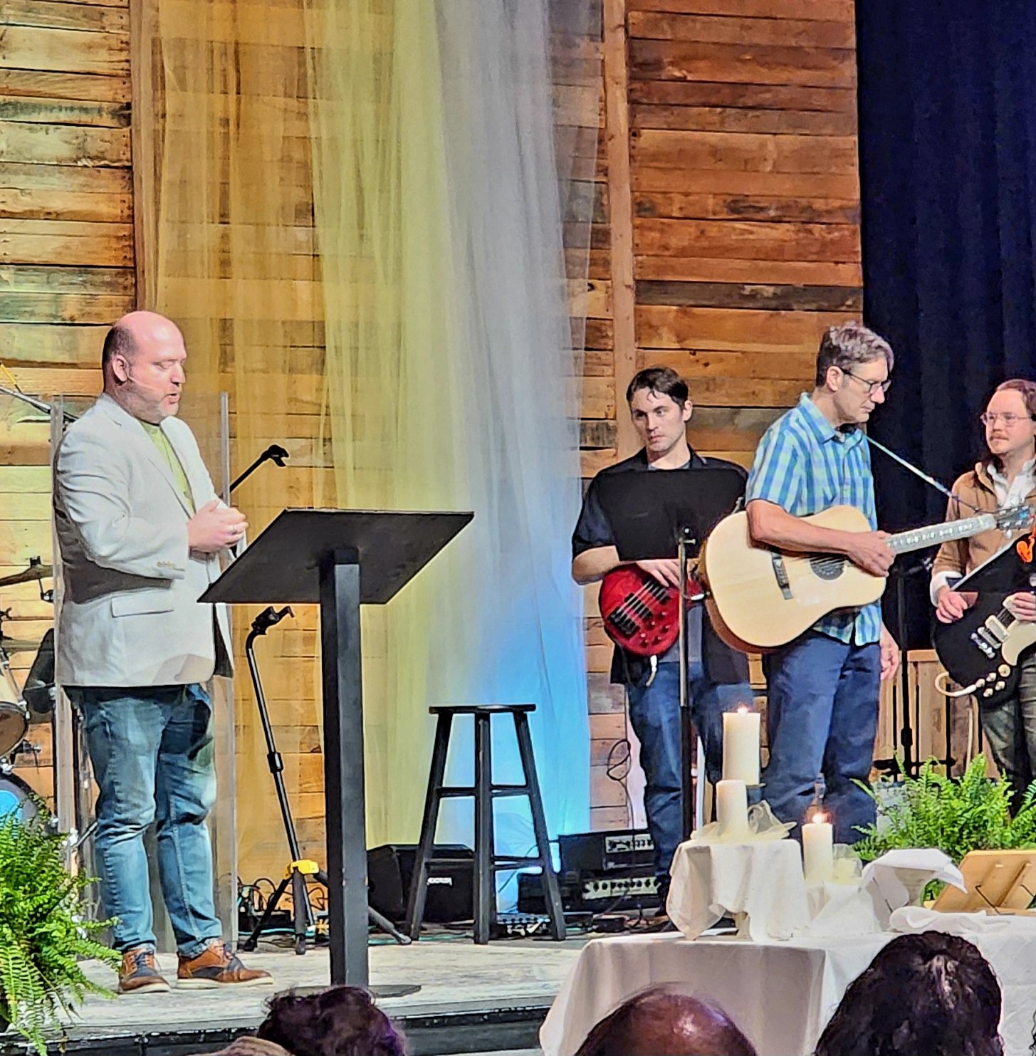 Our “contemporary” worship experience in our Family Life Center on Sundays at 11:00am has more modern music and modern hymn arrangements accompanied by vocalists, keyboard, guitars, drums, and other various instruments. Song lyrics, prayers, and other liturgy are viewable on our screens so you can sing along and/or engage with worship however you feel most comfortable.